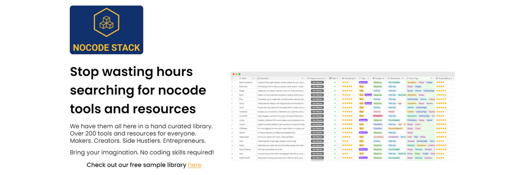 NoCode Stack is a curated library of over 220 free tools and resources you can use to design, build, launch and grow all of your projects.